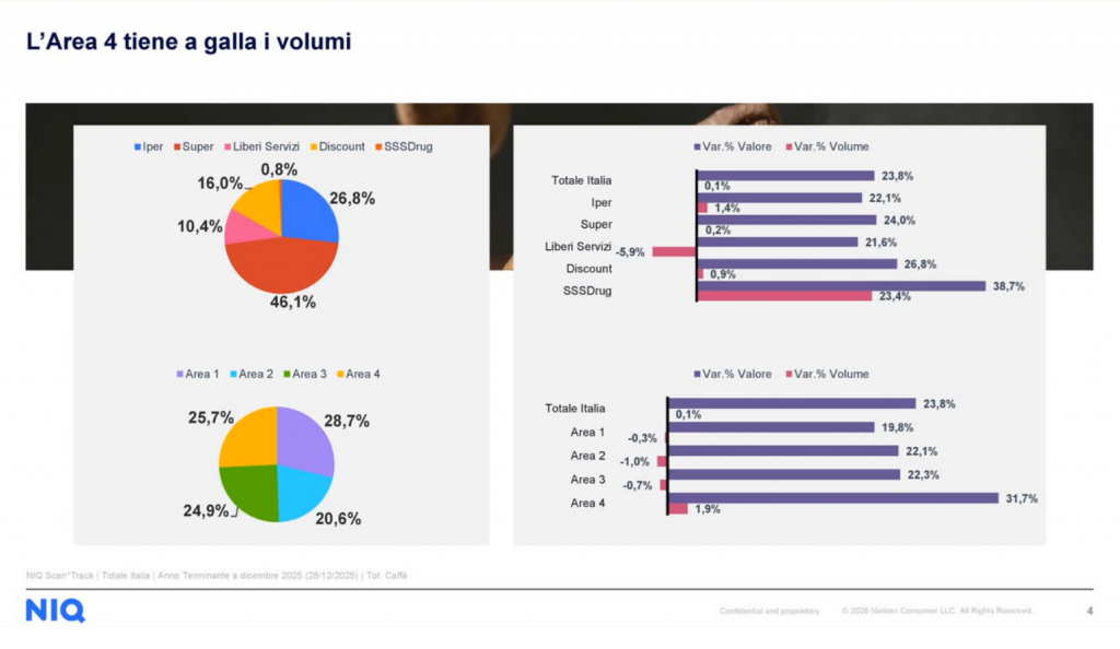 Eppure, mentre tutto si muove, una cosa resta sorprendentemente stabile: il consumo. I dati presentati da Nielsen IQ mostrano una categoria che cresce a valore e tiene nei volumi. Non è un dettaglio, è la prova di una resilienza culturale prima ancora che economica. Il consumatore non abbandona il caffè, ma cambia il modo di viverlo, ad esempio riduce il macinato, esplora i grani, consolida il porzionato, modifica i formati di acquisto.