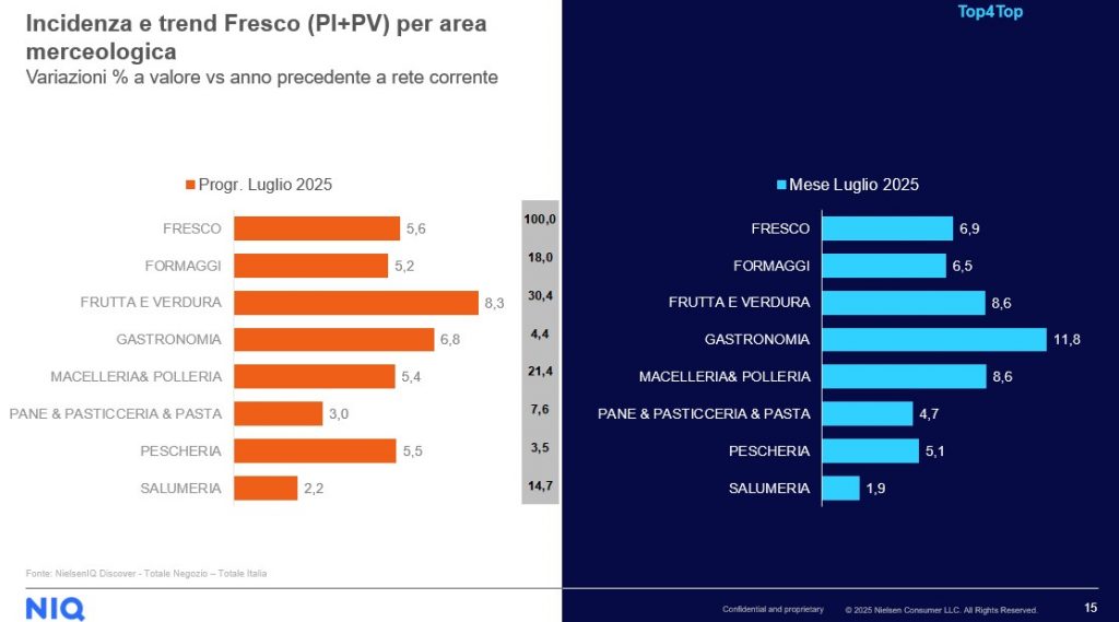Nel Fresco il quadro è ampiamente positivo. Nel progressivo annuo, il comparto cresce del +5,6% a valore, trainato da Frutta e Verdura (+8,3%), Gastronomia (+6,8%) e Pescheria (+5,5%), con Formaggi (+5,2%) e Macelleria & Polleria (+5,4%) solidi e sopra la media. Più contenuta la crescita di Pane, Pasticceria e Pasta (+3,0%), mentre la Salumeria rimane la categoria più debole con +2,2%. La lettura del solo mese di luglio amplifica il trend: Gastronomia vola a +11,8%, seguita da Frutta e Verdura e Macelleria & Polleria (entrambe +8,6%), con il fresco complessivo a +6,9%. Si tratta di reparti che beneficiano della stagionalità estiva, con consumi legati a pasti rapidi, piatti pronti e prodotti freschi a più alto tasso di rotazione.