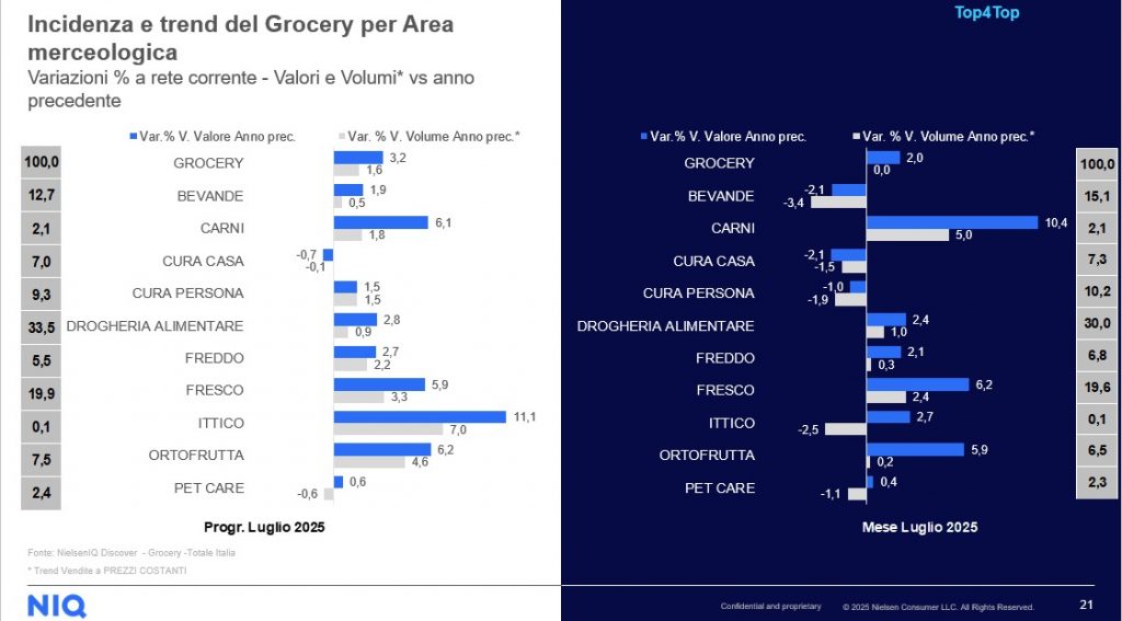 Il Grocery mostra un andamento più sfumato. Nel cumulato annuo cresce del +3,2% a valore (+1,6% volumi), con buone performance di Carni (+0,5% valore, +6,1% volumi), Fresco (+3,3% valore, +5,9% volumi) e Ittico (+3,3% valore, +11,1% volumi). L’Ortofrutta si distingue per un +4,6% a volumi, segnale di stabilità della domanda. Al contrario, categorie come Cura Casa (-0,7% valore) e Pet Care (-0,6% valore) faticano, pur mantenendo volumi pressoché stabili. Nel solo luglio, il Grocery cresce del +2% a valore ma si registrano forti differenze: Carni segna un +10,4% a valore con volumi in crescita del +5%, Fresco a +6,2%, Ortofrutta a +5,9% volumi. In calo invece Bevande (-3,4% valore, -2,1% volumi) e Ittico (-2,5% valore).