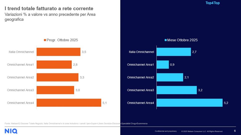 Questo quadro porta a un dato progressivo annuo molto positivo: la crescita cumulata del totale Italia Omnichannel, dopo dieci mesi del 2025, è pari a +3,5% rispetto allo stesso periodo del 2024. Si tratta di un dato particolarmente rilevante, in quanto superiore alla media inflattiva, segnalando una crescita reale dei consumi nella GDO.