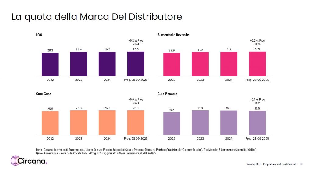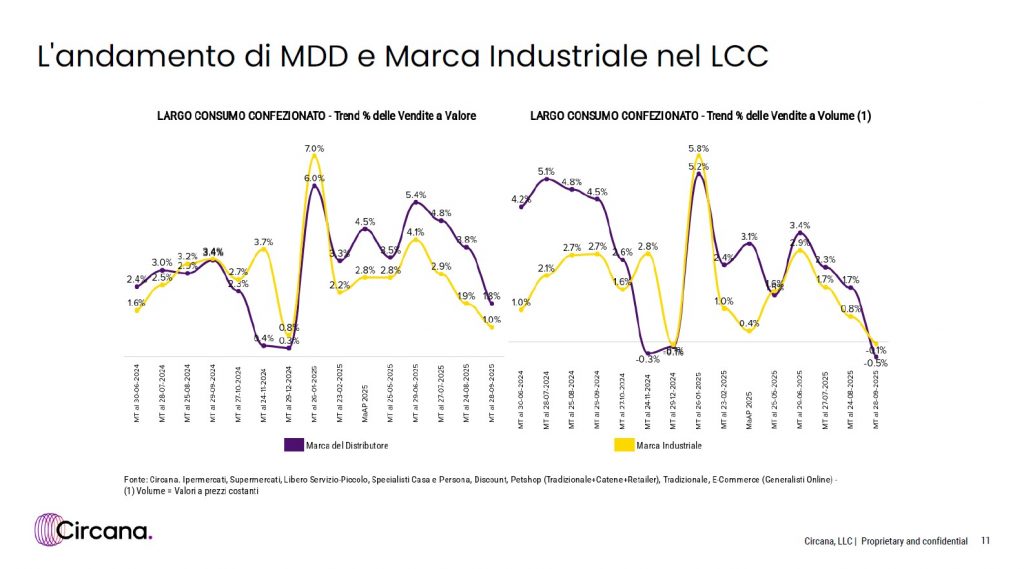 Dopo tre anni di ascesa continua, la Marca del Distributore ha arrestato la corsa nei mesi centrali del 2025, così come accade – in verità – anche alla Marca industriale. E’ possibile che il 2025 segni un punto di svolta per il mercato del Largo Consumo Confezionato.