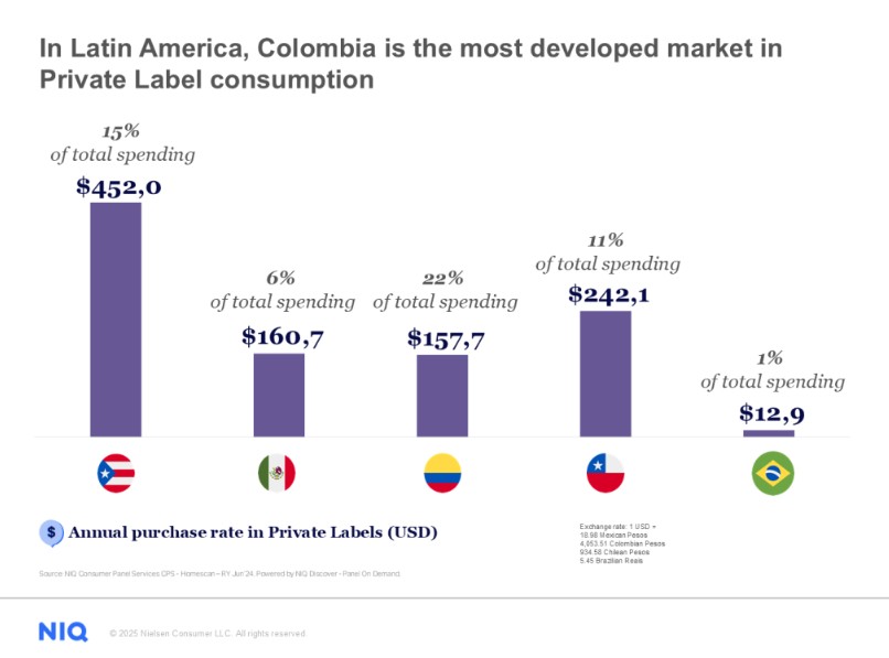 El consumo de marcas propias se consolida como uno de los fenómenos más transformadores del gran consumo en América Latina. Según datos de NielsenIQ, Colombia se posiciona como el mercado más desarrollado de la región, con las marcas del distribuidor representando ya el 22 % del gasto total de los hogares y un consumo medio anual de 157,7 dólares por persona. Este avance ha sido impulsado principalmente por el crecimiento de los hard discounters D1 y Ara, cuyas ventas dependen en más de un 40 % de productos de marca propia. Ningún otro país latinoamericano alcanza un nivel de penetración similar, reflejo de un modelo comercial basado en la eficiencia, la proximidad y una propuesta de valor clara y coherente.